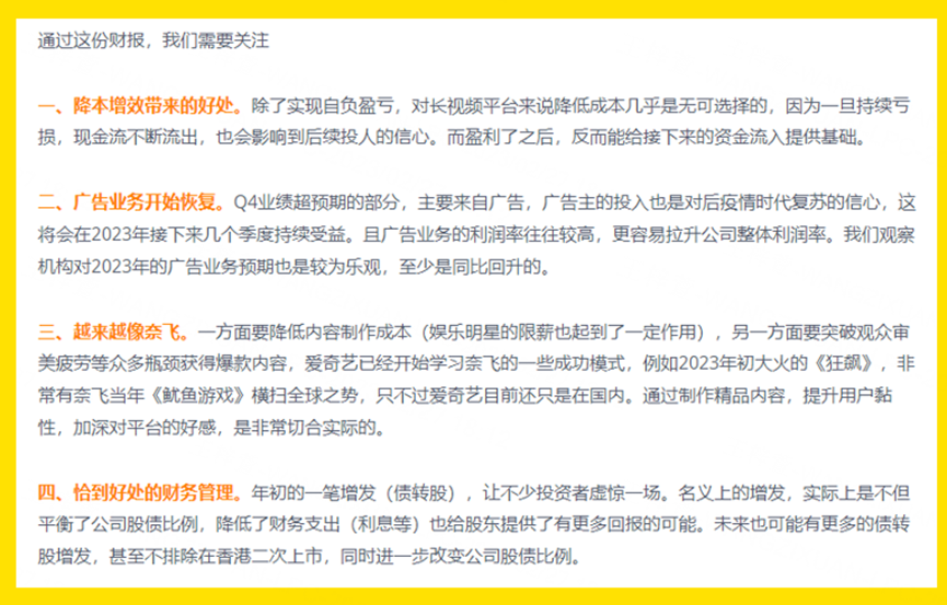 如在这篇文章中,开头便写出了爱奇艺本次收入和盈利均超过预期,现金流也在不断改善的重点。在下面展开说明的时候,读者会感觉到阅读起来逻辑清晰。