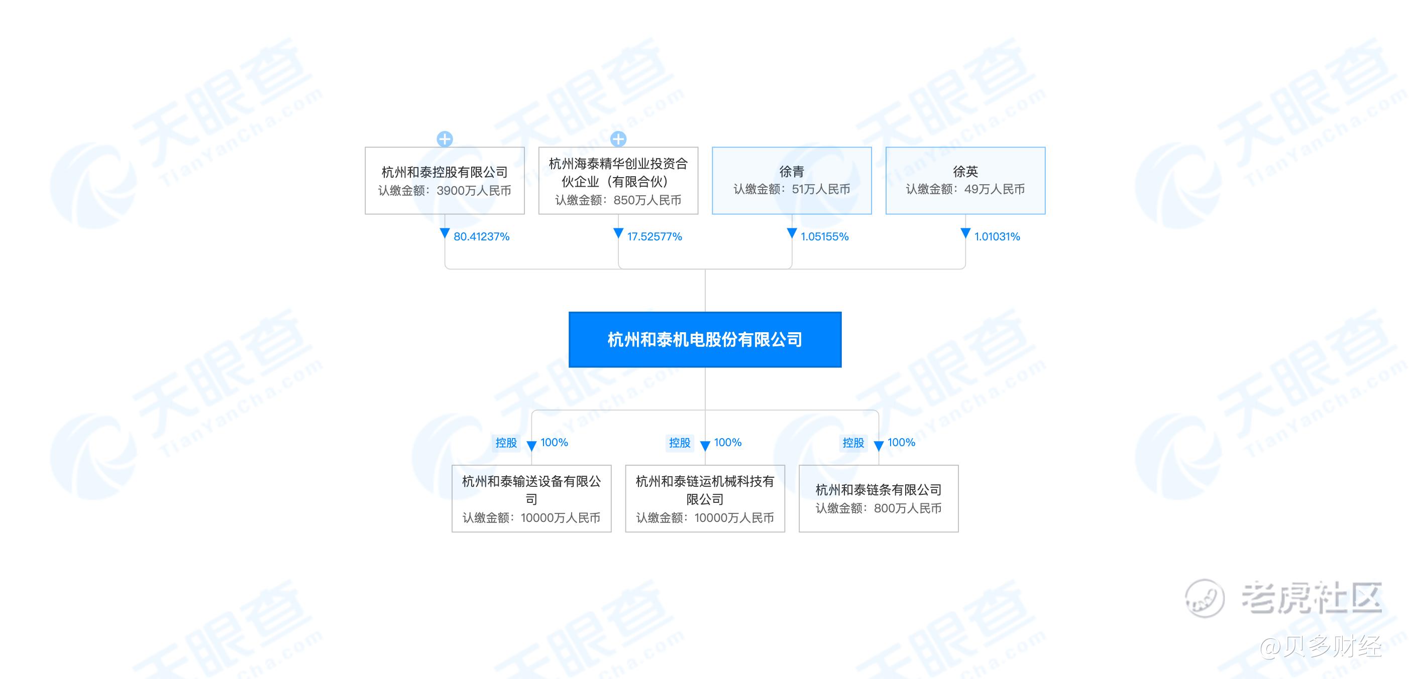 天眼查信息显示,和泰机电成立于1995年,前称包括萧山和泰机电工业有限公司、杭州和泰机电工业有限公司等。目前,该公司的注册资本为4850万元,法定代表人为徐青,股东包括和泰控股、徐青、徐英等。