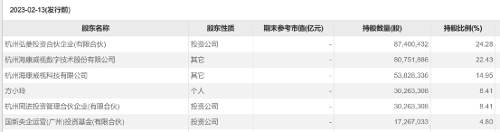 其中,杭州海康威视数字技术股份有限公司持股22.43%,杭州海康威视科技有限公司持股14.95%。