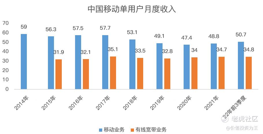 导致收入下滑的原因之一是国家提出电信行业要降费提速,从中国移动单用户月收入来看,2014年时,单用户月度收入为59元,2020年时降至47.4元: