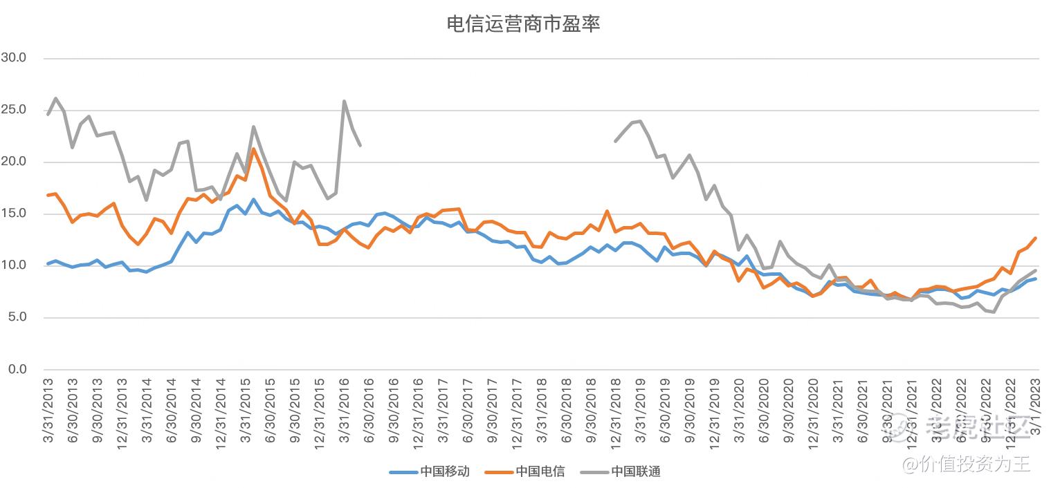 除此之外,连续下跌之后的电信运营商的市盈率估值来到近10年来的低位: