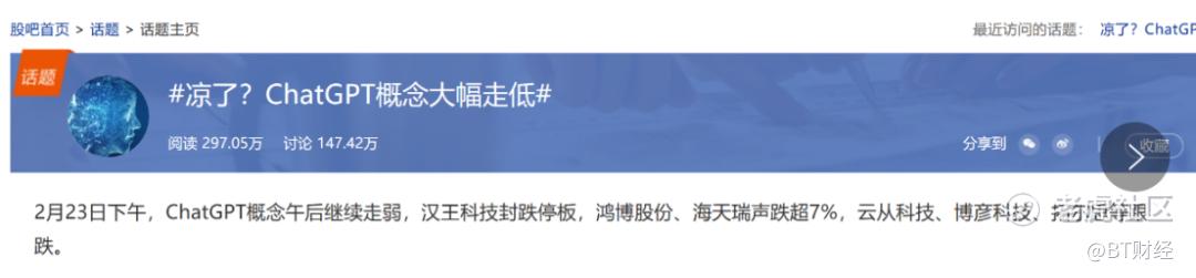 随着ChatGPT概念股的大热,很多公司股价暴涨,但和一些大佬的摩拳擦掌不同,有些投资人也开始趁机减持套现。随之在度过ChatGPT的疯狂期之后,资本市场开始逐渐进入冷静期,在2月23日下午,相关概念股继续走弱,股价大幅走低,一度7连涨的汉王科技开始出现跌停,鸿博股份以及海天瑞声跌幅超过7%,AI四小龙之一的云从科技和博彦科技也出现不同程度的下跌。