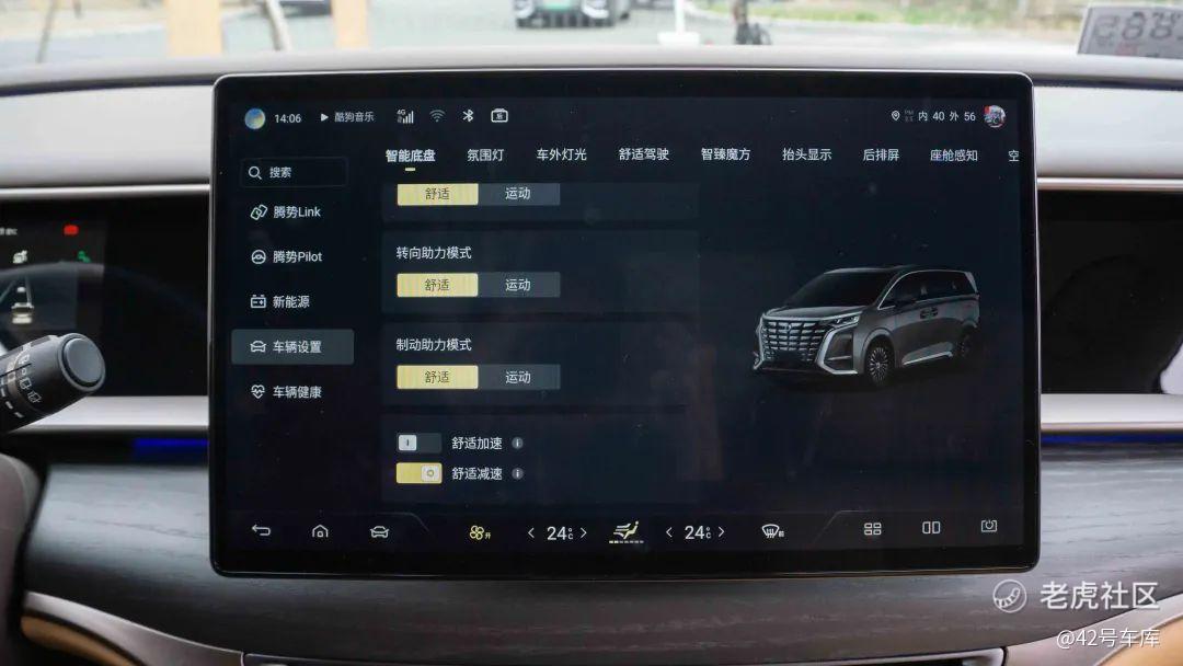加减速踏板也是如此,较沉的脚感外加长踏板行程,也能够让车辆得到精准的加减速控制。在系统选项中,智能底盘的调节项很多。制动助力有两档可选,舒适模式下能提供柔和的前段制动反馈,运动模式下前段制动反馈则会明显很多,有助于增强高速行驶的制动信心。