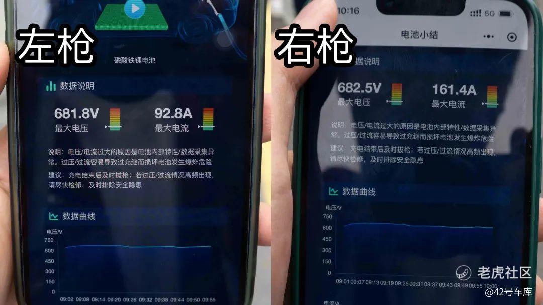 充电过程中,左枪额定功率为 60 kW,实测最大电流 98.2 A,最大电压 681.8 V,功率达到 66.9 kW。右枪额定功率为 120 kW,实测最大电流 161.4 A,最大电压 682.5 V,功率达到 110.2 kW。双枪合计最大功率为 177.1 kW,已经超过了官方宣称的 166 kW 了。而且当 SOC 为 25% 的时候就已经达到了 167 kW 的峰值功率,实测效率非常可观,而且对于 103 kWh 的大电池来说确实具有意义。