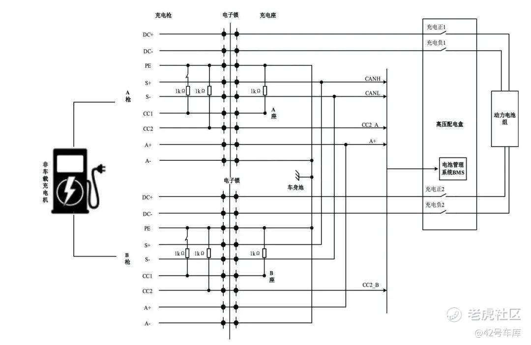 BMS 依旧通过充电枪的物理连接信号 CC2 作连接判断,只不过多了一个 CC2 信号来识别单、双枪充电模式罢了。信号识别过后,由双路通讯实现双枪异步工作,所以不同直流枪任意组合在高压配电盒内进行电流合流,再给动力电池组补能。这样就能够在原先 250 A 的电流上进行增流,以达到提升功率的效果。