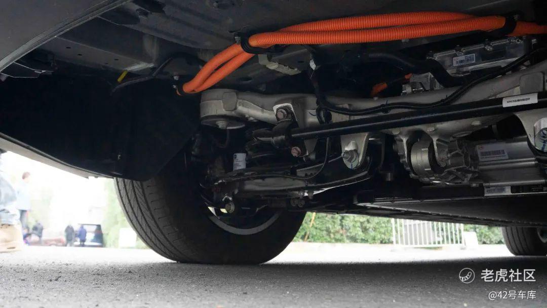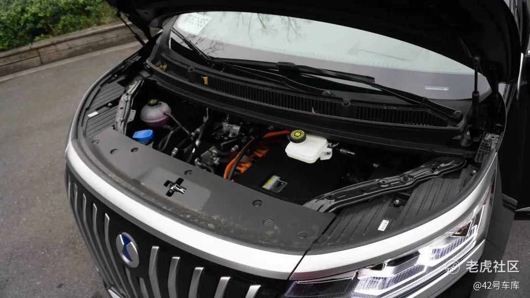 少了一个内燃机之后,我本以为前舱内会安放一个前备箱。打开之后则是空空荡荡的,日常维保需要更换的刹车油、玻璃水、冷却液壶都有意抬高位置,便于后期更换。布在下方的是常规的高压控制器和电机等,上方的空间若在后期能装个小尺寸的前备箱,会更加实用。