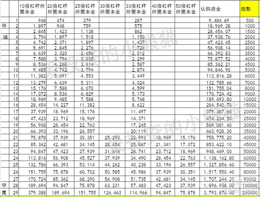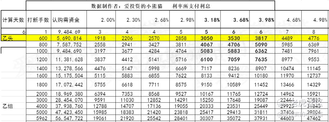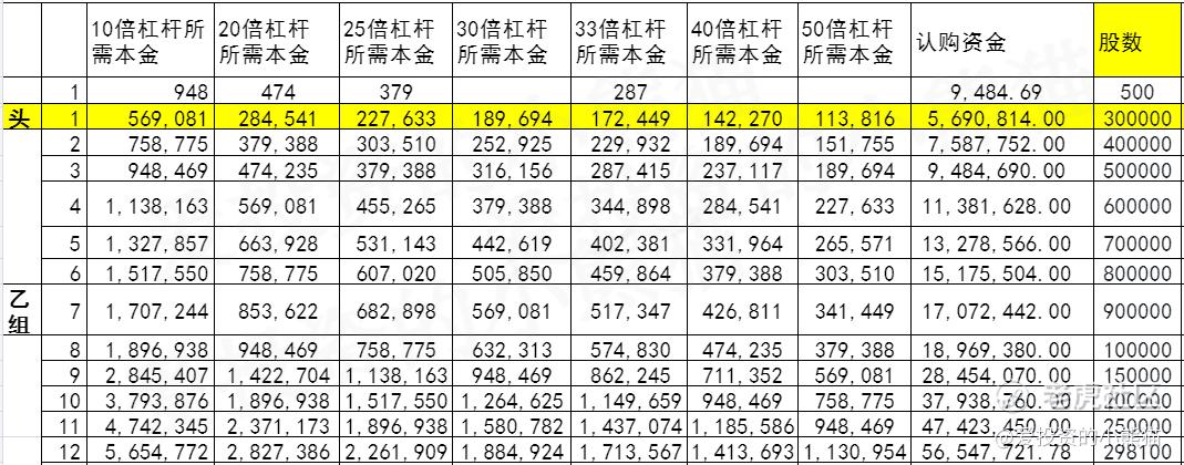 乙组头,这次是570万本金,乙组的各档融资所需要的本金还有融资金额对应如下表: