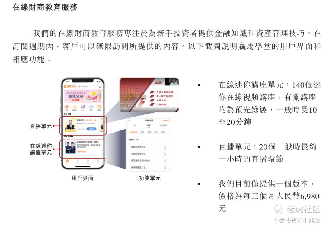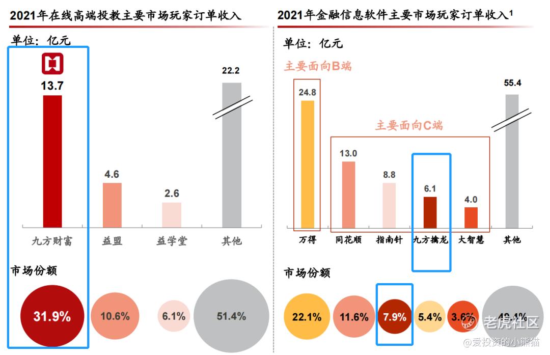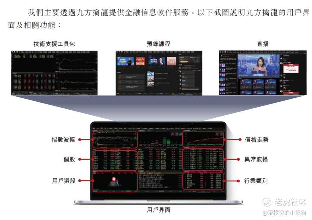 九方财富是中国第一大在线高端投教服务提供商,专注于为个人投资者提供投资决策辅助服务。和同花顺还有指南针很像,估计不少人都体验过。公司产品线:1. 向大众富裕人群提供在线高端投教服务;2.向拥有更多投资经验及更复杂需要的投资者提供金融信息软件服务,帮助个人投资者更好地了解金融市场及制定投资计划或决策;3.为新手投资者提供在线财商教育服务。