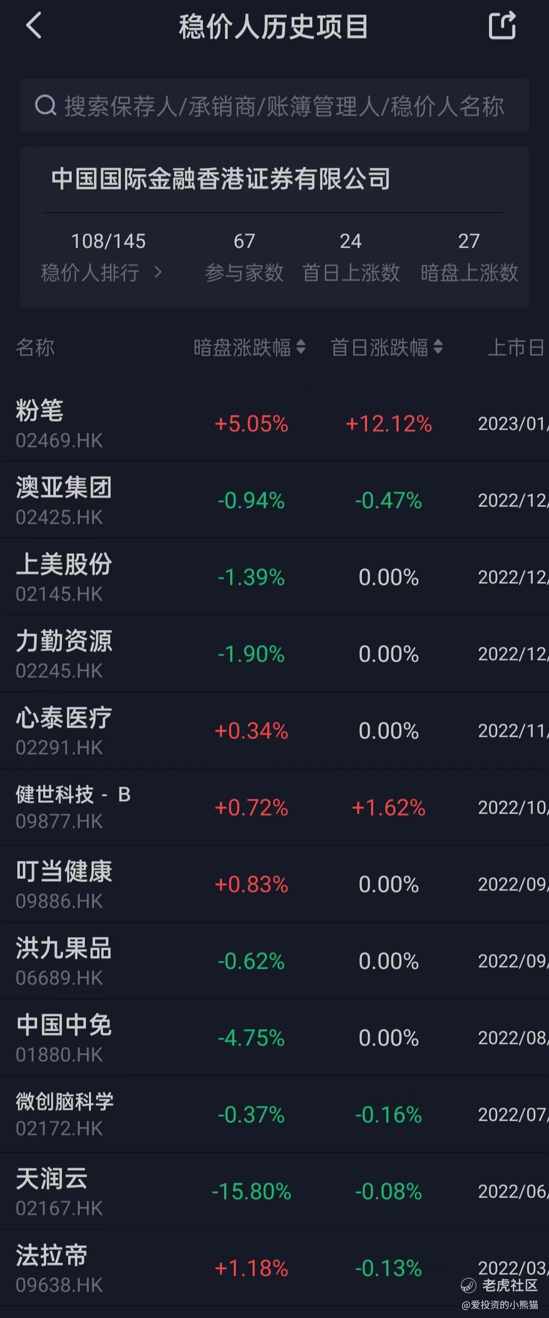 稳价人也是中金,中金的项目今年下半年连续几个项目涨跌幅都是0%~1%左右,很多新股不涨也不跌的这种都护盘护住了,中金的手法是是大单直接打在发行价让大家来砸,甚至像粉笔这样的还能涨一些。