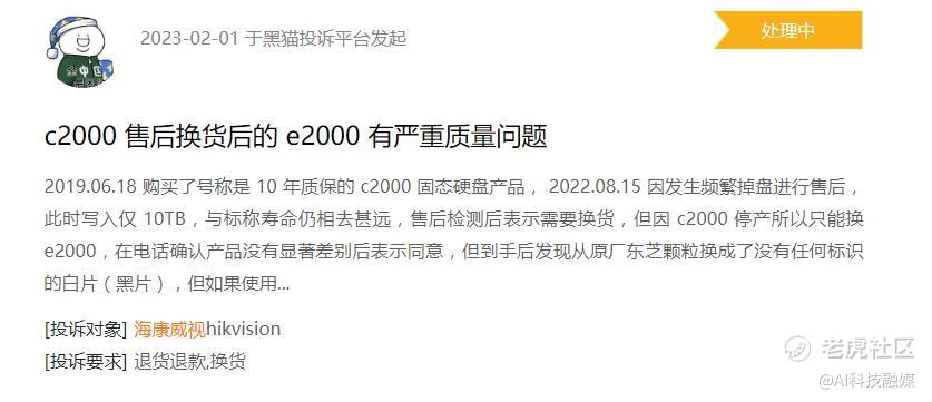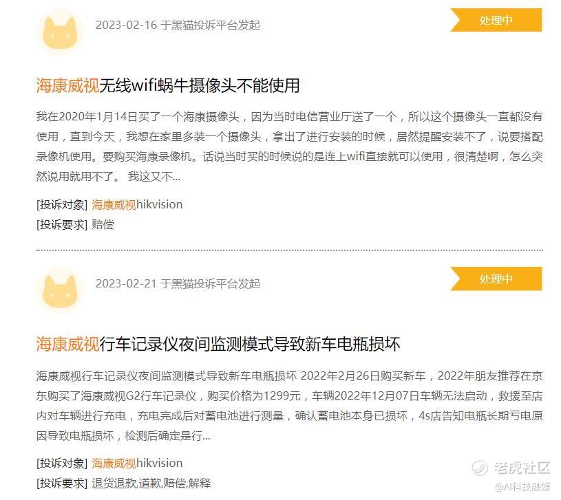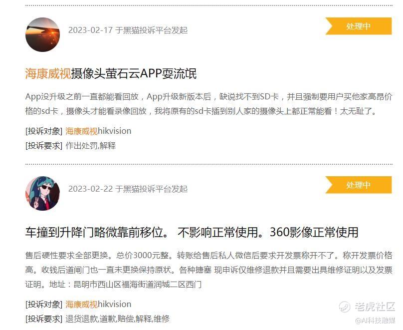 目前这些投诉均显示在处理中,尚未见有处理完毕的,产品是企业最好的名片,也希望海康威视能真正重视起来,包括但不限于努力提升售后服务体验,提升产品质栓标准等,只有产品质量过硬,用户才不会源源不断流失!