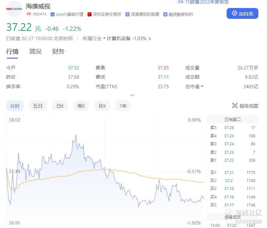 截至2023年2月27日收盘,海康威视报37.22元/股,跌1.22%,总市值3485亿,较之于其巅峰时的5767亿市值,蒸发逾2200亿!