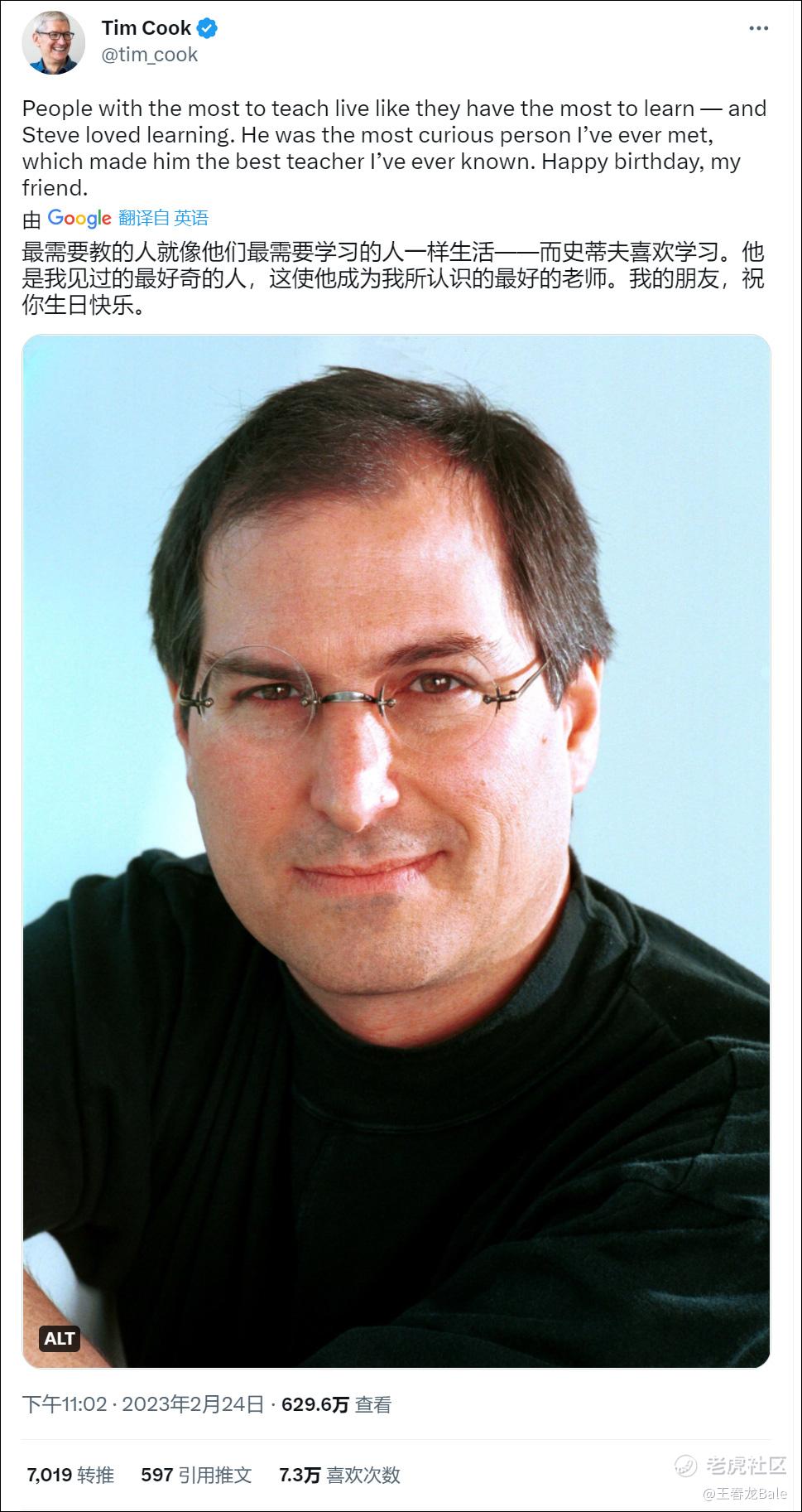 1.昨天(2月24日)是苹果公司创始人史蒂夫·乔布斯的生日。作为现任苹果公司CEO,蒂姆·库克在社交媒体上发表了怀念乔布斯的内容。他表示,“史蒂夫非常好学,他是我见过的最好奇的人,这使他成为我认识的最好的老师。生日快乐,我的朋友”。