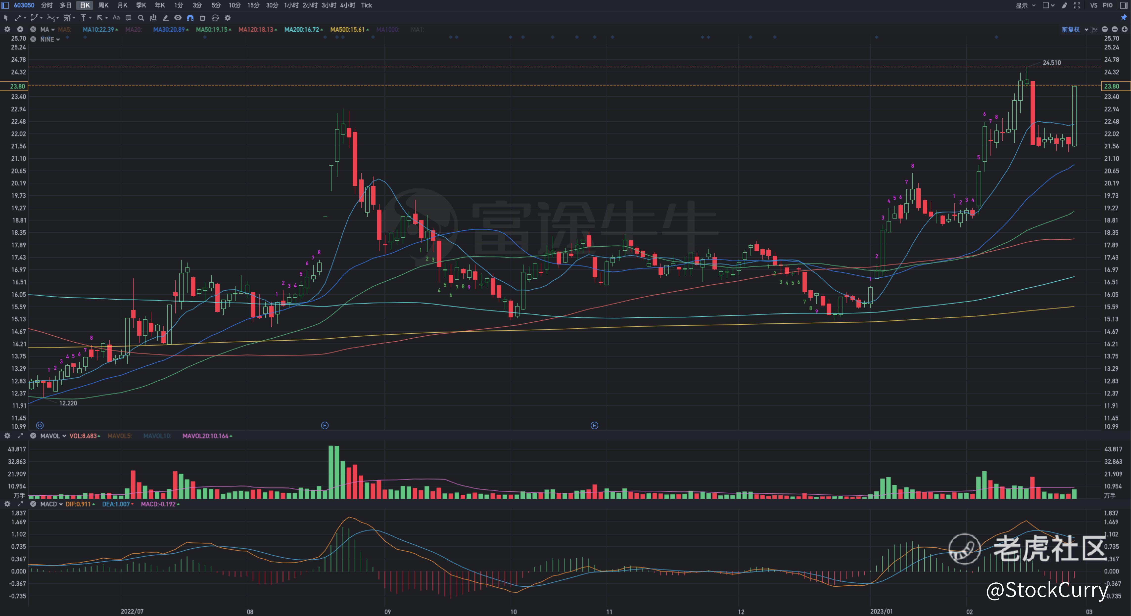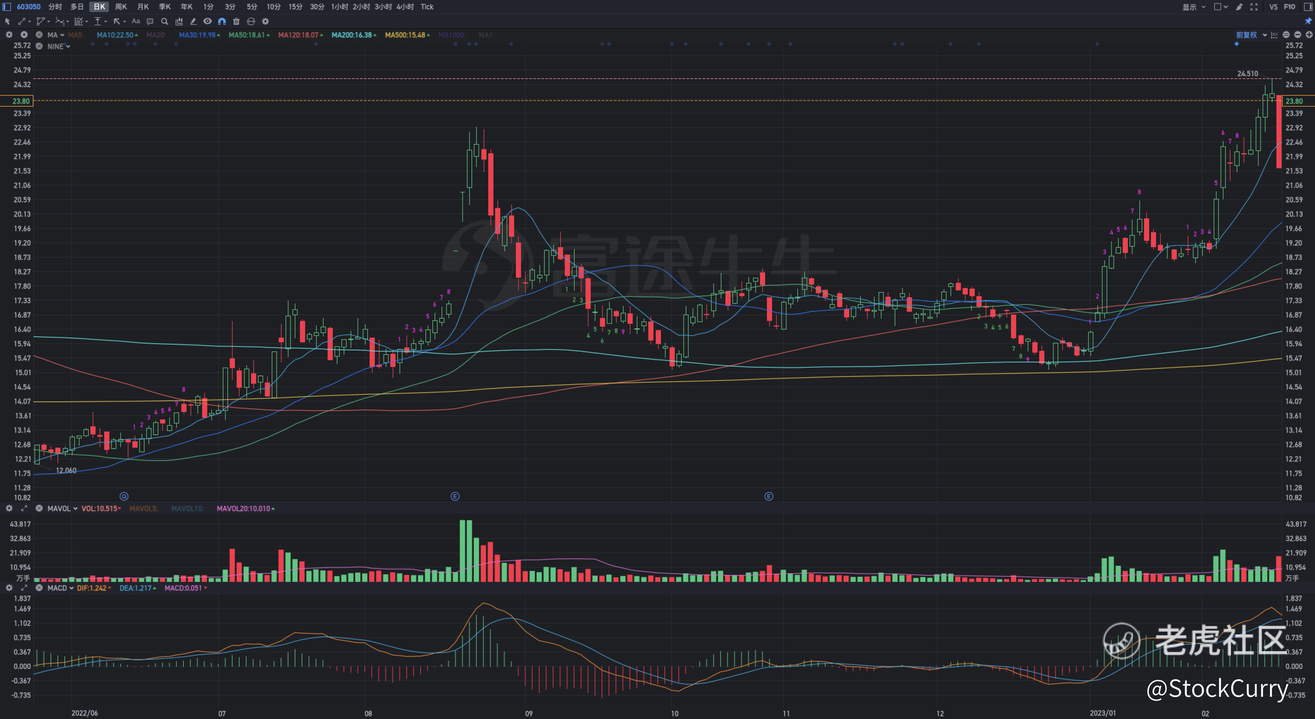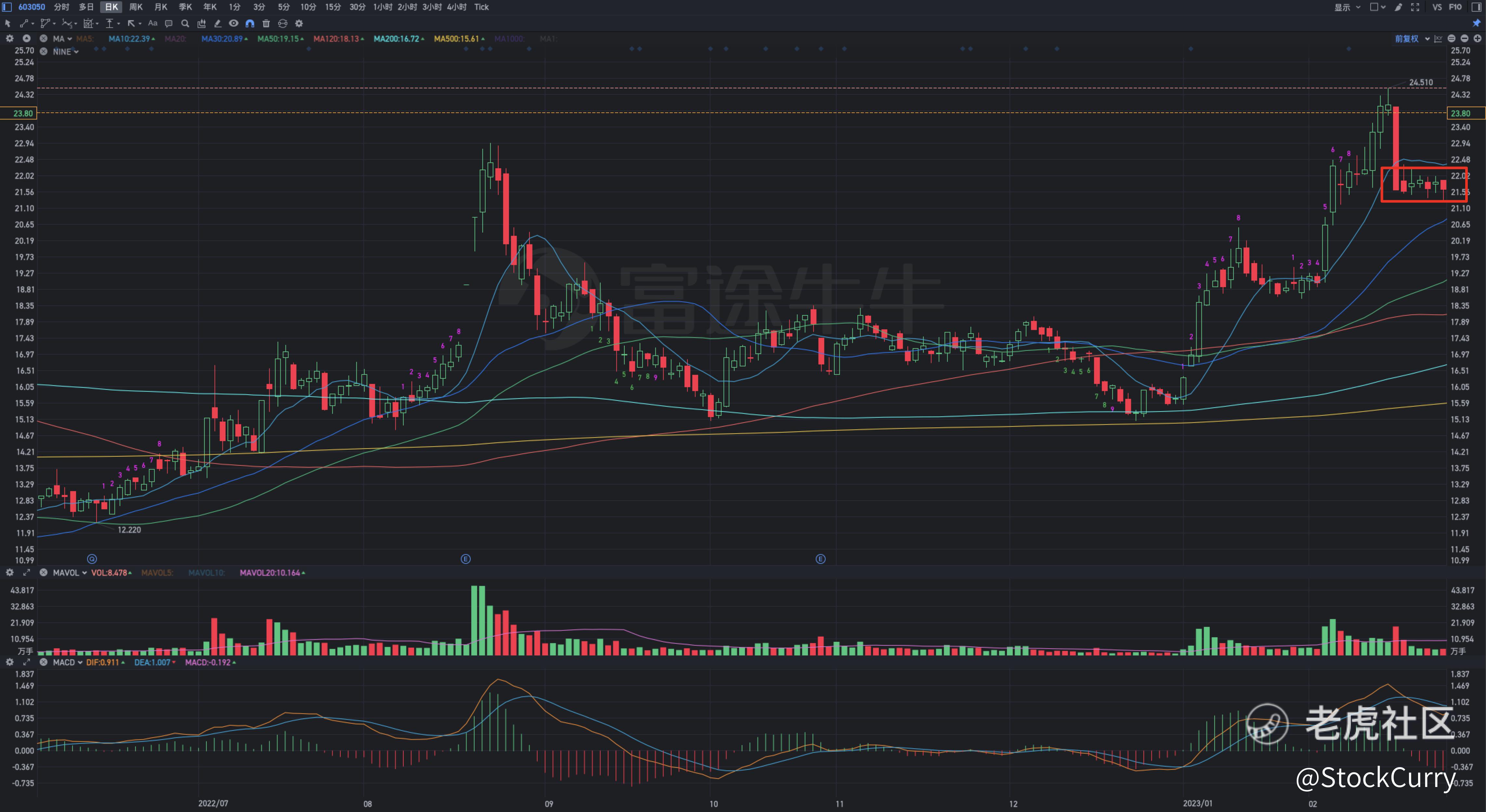 但是这支股票在跌停第二天之后并没有继续向下大跌,而是横盘了6天,形成了一个箱体,这就极其的反常了,所以我加入到了我的关注列表里,并在24.51也就是前高的位置设了提醒。