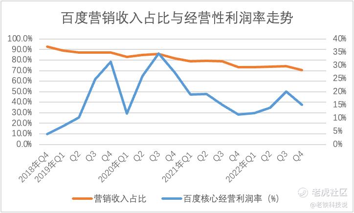 情况也确实如此,在百度核心营销收入占比下降之时,经营性利润率也呈明显的收缩态势,不过我们也注意到相比于营销收入占比曲线的平滑,另外经营性利润的折线则表现为跌宕起伏(与新兴业务初期的高投入有关),进入2021年之后则逐渐平滑,此次财报市场普遍看好经营性利润好转,在图中也能看到2022下半年此部分有企稳的势头。