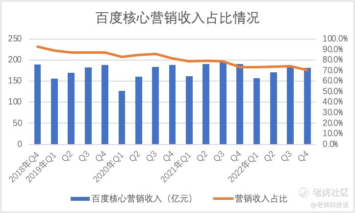 营销类收入一直是百度核心的最重要收入,该部分业务成熟,收益稳定,但由于新兴业务兴起(如云计算,汽车业务等等)会摊薄该业务权重,在上图中我们也看到该业务占百度核心总营收比重乃是不断下降的,在2022年Q4终于跌到了70%的水平。