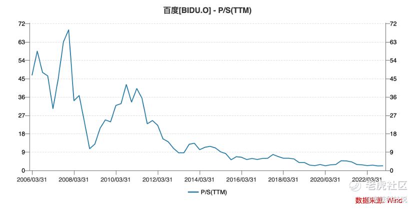由于“总市值=总营收*市销率”,市销率又反映了未来增长预期,在一个成长股的分析框架中,其市值拉动主要靠市销率的乘数效应的放大(如特斯拉在10倍左右)。如今百度TTM市销率多徘徊在2.5倍左右水平,乘数效应稳定且低,拉动市值就要靠总营收的增长。