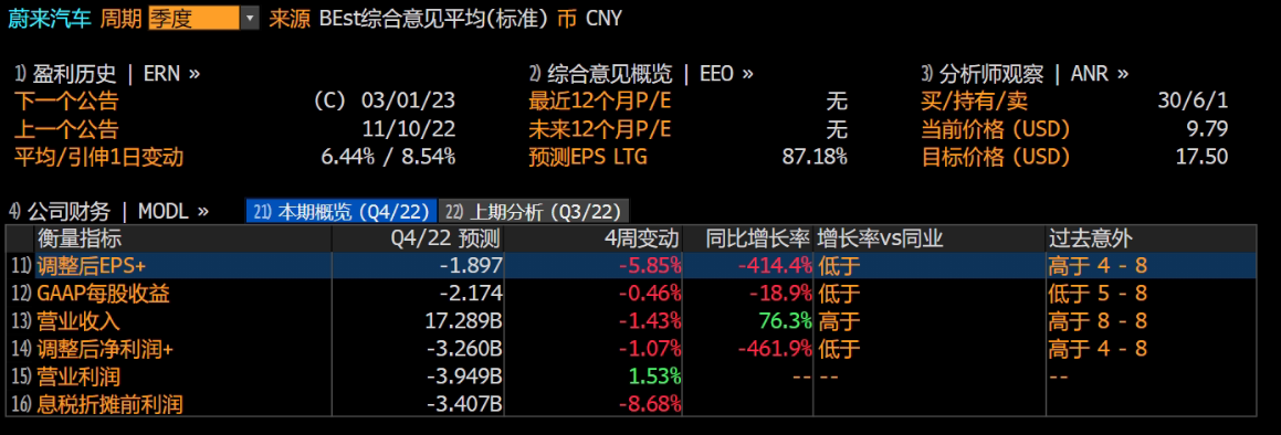 4. 周三美股盘前,蔚来汽车发布财报,彭博分析师预期四季度营收为172.89亿,同比增长74.6%: