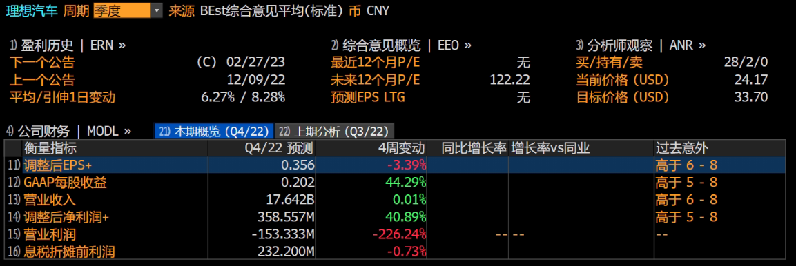 1. 周一,美股盘前,理想汽车公布财报,彭博预期四季度营收176.4亿,同比增长66%: