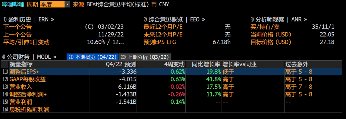 5. 周四美股盘前,哔哩哔哩公布四季报,彭博分析师预期营收61.16亿,同比增长5.8%: