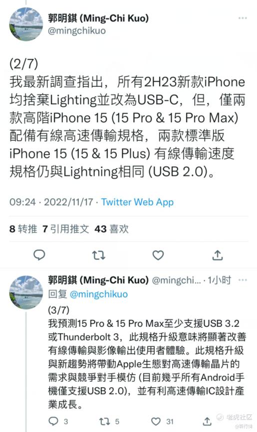 一是iPhone 15全系搭载的USB-C口,可能会分为高低两个版本:高阶版15 Pro和15 Ultra会采用有线高速传输规格;标准版15和15 Plus则会采用和当前Lightning口相同的有线传输速度规格,也就是USB2.0传输速率。