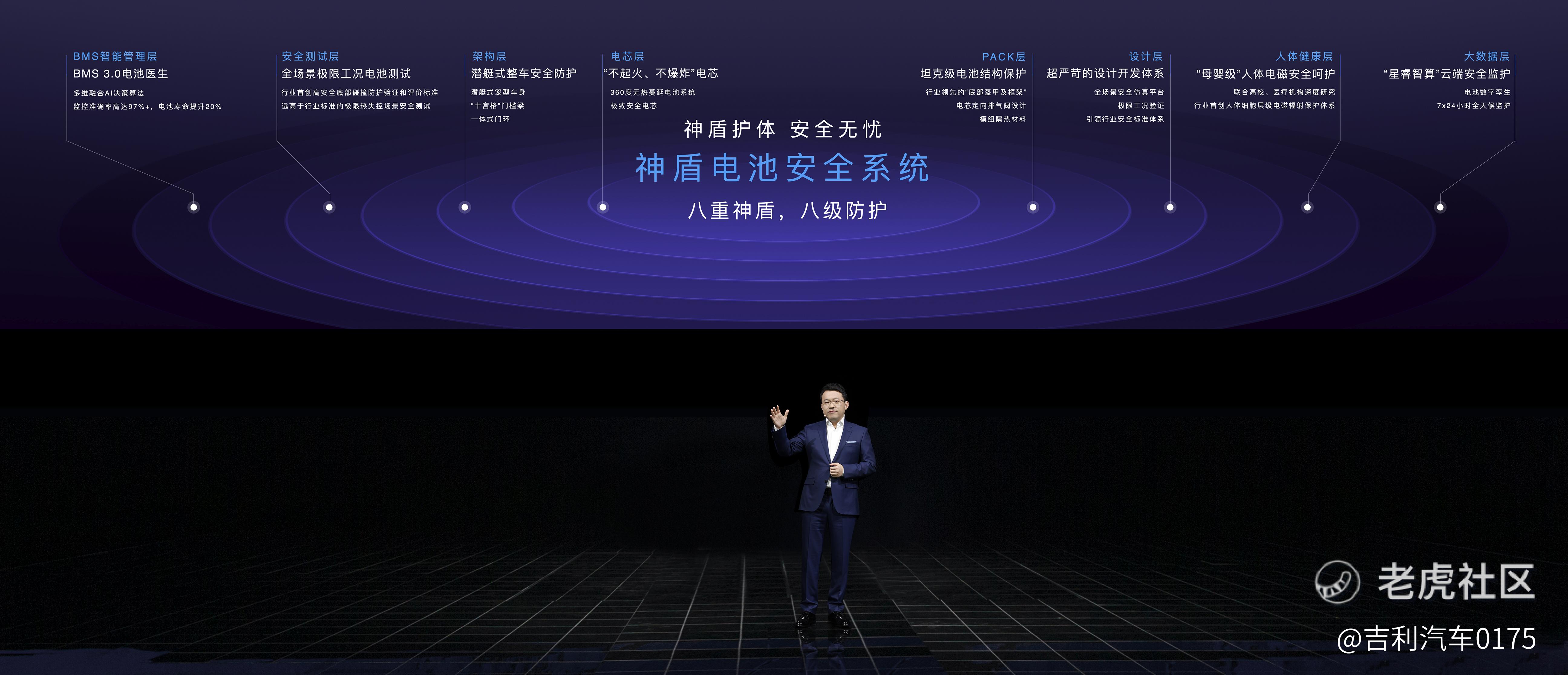 吉利独创的“神盾电池安全系统”不止预防电芯自燃,更构建起一整套基于电池,又融合了架构、整车、智控、云端的“无盲区”安全防护系统,能够通过“架构十宫格专利、整车笼式防护、快充安全无忧、BMS3.0‘电池医生’智控系统”等8重护盾,保障电池包Pack及电池模块等系统安全。