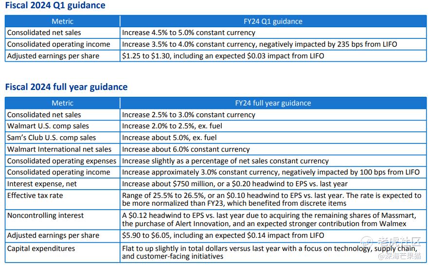 然而这次沃尔玛(WMT)给出的盈利指引未达到市场预期。市场预计2024财年销售额同比增长3%,调整后每股收益同比增长7.2%