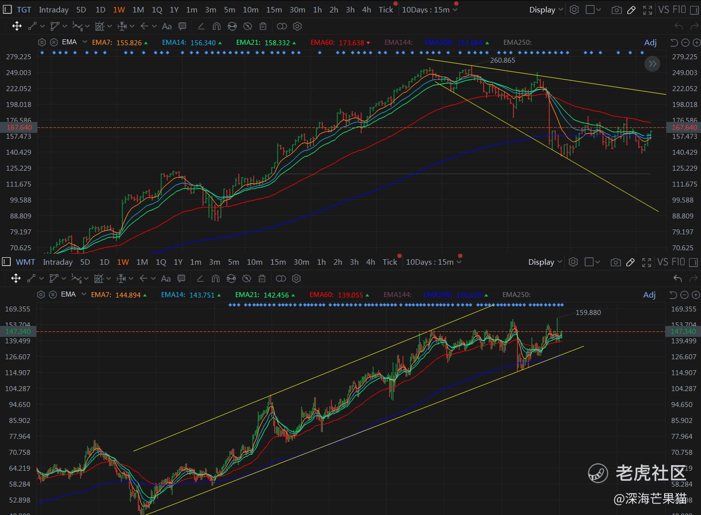 这点对比下塔吉特(TGT)和沃尔玛(WMT)的股价表现就会发现塔吉特(TGT)去年开始就已经进入下行通道,而沃尔玛(WMT)仍处于上升通道。