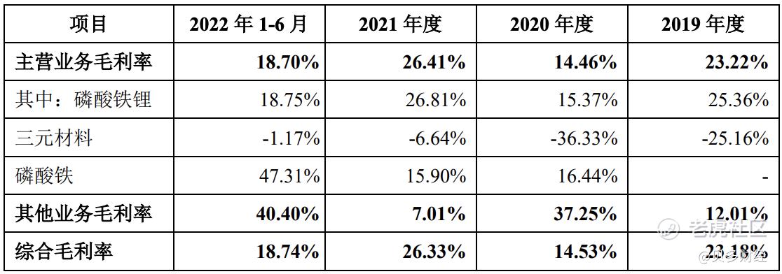 报告期内(2019年至2022年上半年),湖南裕能的综合毛利率分别为23.18%、14.53%、26.33%和18.74%。湖南裕能在招股书中解释称,由于上游原材料价格波动、下游客户需求变化、市场竞争格局变化等因素影响,该公司综合毛利率存在一定波动。