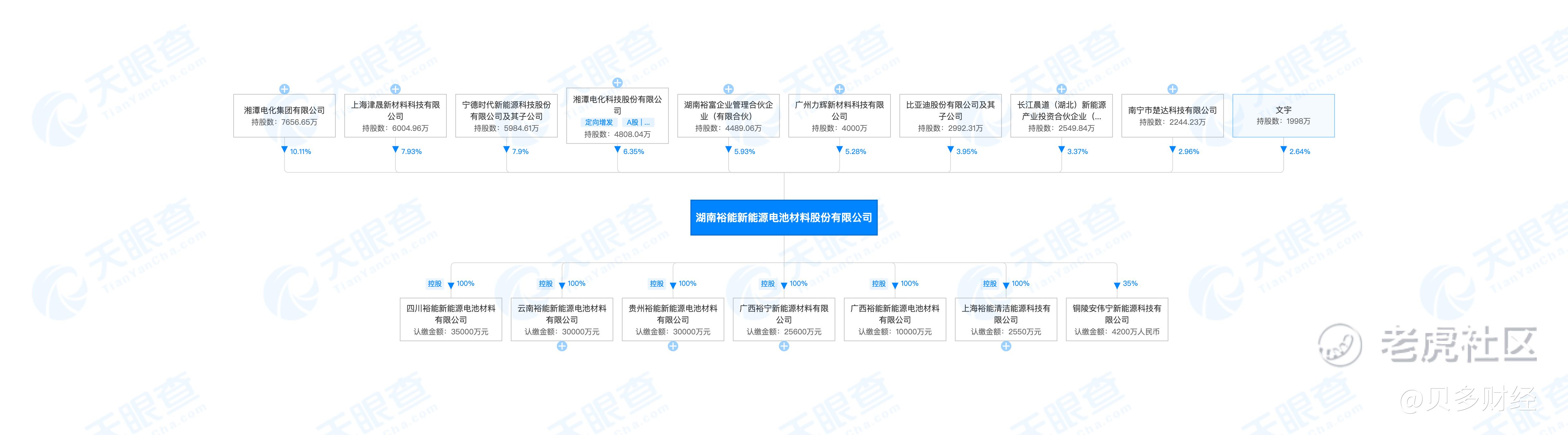 天眼查信息显示,湖南裕能成立于2016年6月,是一家锂离子电池正极材料供应商,专注于锂离子电池正极材料研发、生产和销售,注册资本约为5.68亿元,法定代表人为谭新乔,股东包括湘潭电化(SZ:002125)、宁德时代(SZ:300750)、比亚迪(SZ:002594)等。
