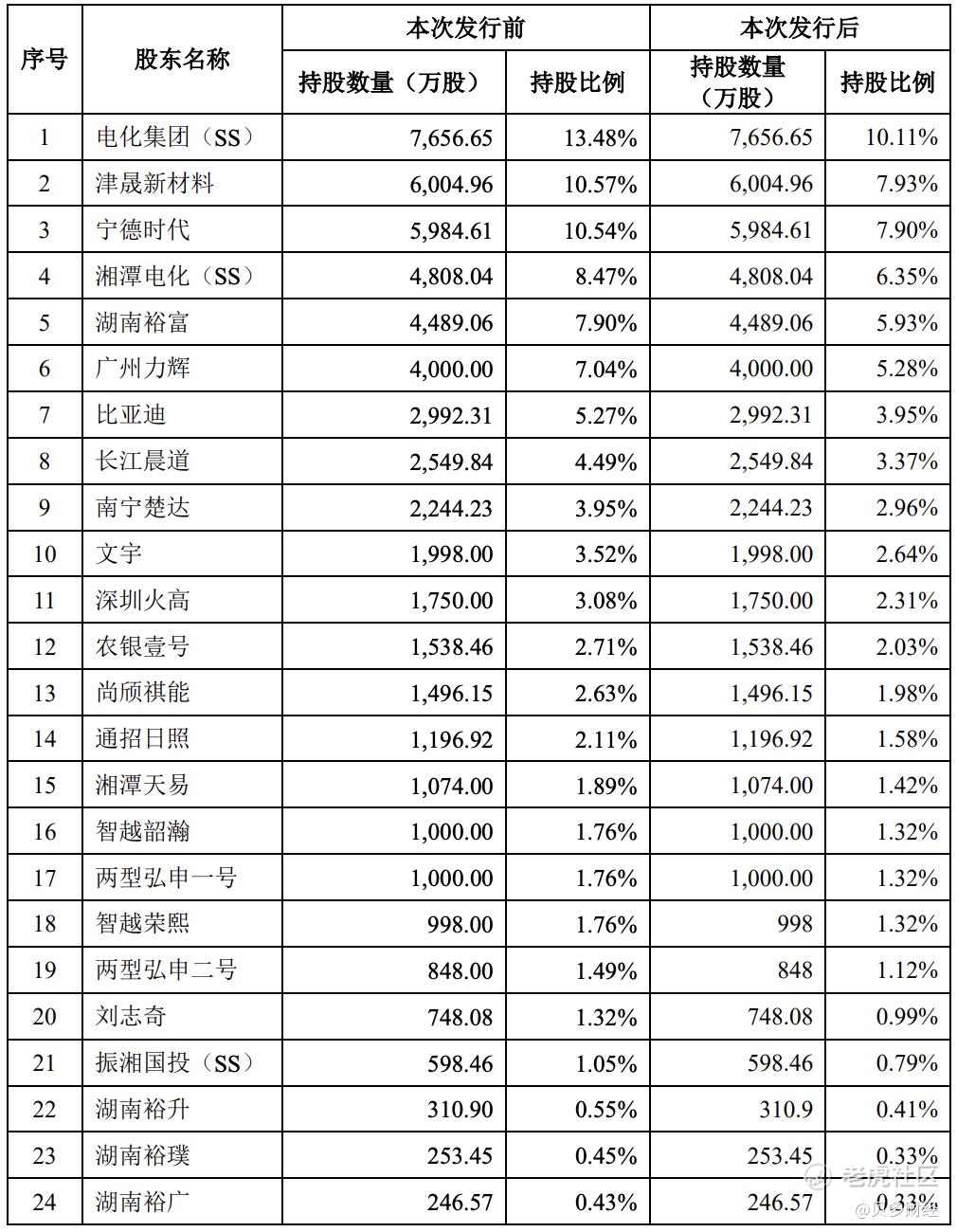 IPO前,电化集团(SS)持股13.48%,湘潭电化(SS)持股8.47%,湖南裕富持股7.90%,广州力辉持股7.04%,比亚迪持股5.27%,长江晨道持股4.49%,南宁楚达持股3.95%,文宇持股3.52%,深圳火高持股3.08%。