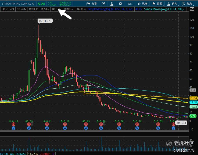 今天很多二线的成长股都开始暴涨模式,他们去年都跌了80%,比如 服装租赁公司 $Stitch Fix Inc.(SFIX)$ ,今天暴涨15%,公司没有任何新闻,而是被整个二线成长股板块带动,去年1月股价 113美元,现在5美元,跌了80%,意味着什么?