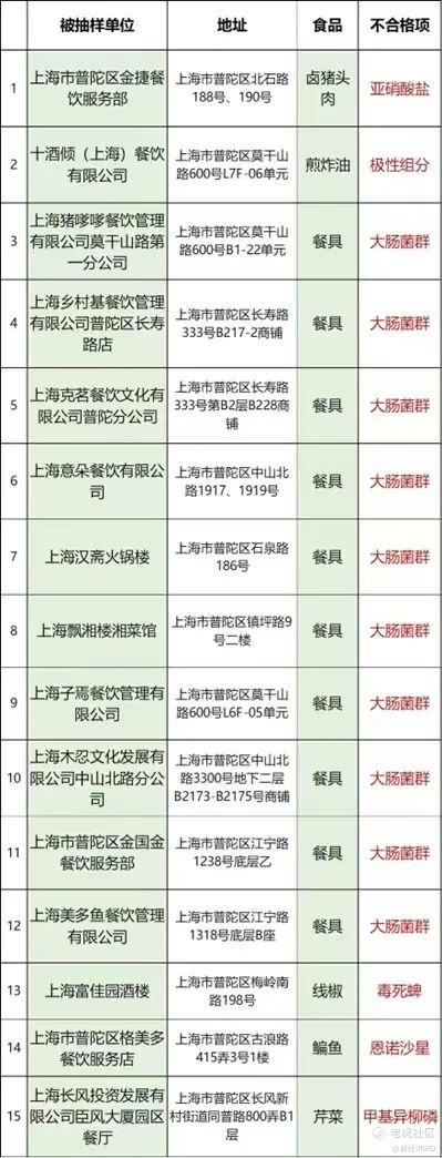 2022年8月,上海市普陀区市场监督管理局近期抽检各类食品共计1455批次,其中,在15家餐厅检出不合格食品,涉及餐具、鳊鱼、芹菜、线椒、卤猪头肉、煎炸油等。