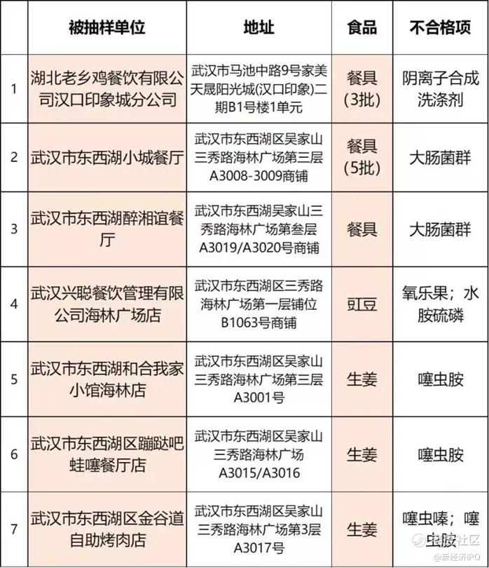 近期,武汉市东西湖区市场监管局对餐饮单位组织了食品安全监督抽检,本期共计抽检各类餐饮食品108批,检出不合格13批,涉及区内老乡鸡、醉湘谊、大米先生等7家餐厅,问题主要包括餐具卫生不合格、豇豆和生姜农残超标。