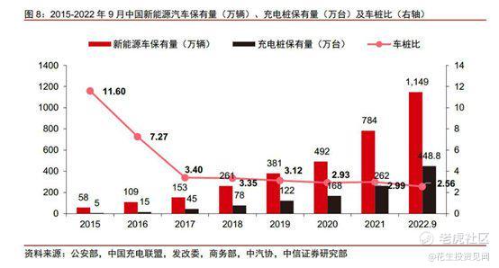 截至 2022 年 9 月,我国新能源汽车保有量达1149 万辆,充电桩保有量达 448.8 万台,车桩比为 2.56,较 2015 年的 11.6 实现大幅下降。