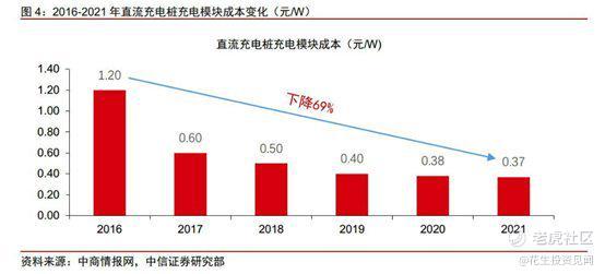 成本端:充电模块是充电桩硬件的核心,成本占比最高,其余主要部件包括,APF有源滤波、电池维护设备、监控设备等,具体而言,交流充电桩(7kw)的总体成本为7000-8000元/桩,直流充电桩(60kw)的总体成本为70000-80000元/桩。充电站一般按单瓦计价,每瓦单价约为0.5-1.3元/w。