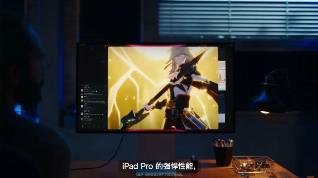 有趣的是,这已经不是苹果第一次剧透《崩坏:星穹铁道》的上线时间。在去年10月举办的苹果秋季新品发布会上,新一代iPad Pro的官方宣传片中就出现了《崩坏:星穹铁道》的画面,苹果还特别在字幕下方标注了该游戏将于2023年推出。而在当时,《崩坏:星穹铁道》甚至还没有拿到版号,苹果的这番未卜先知,也让玩家相当振奋。