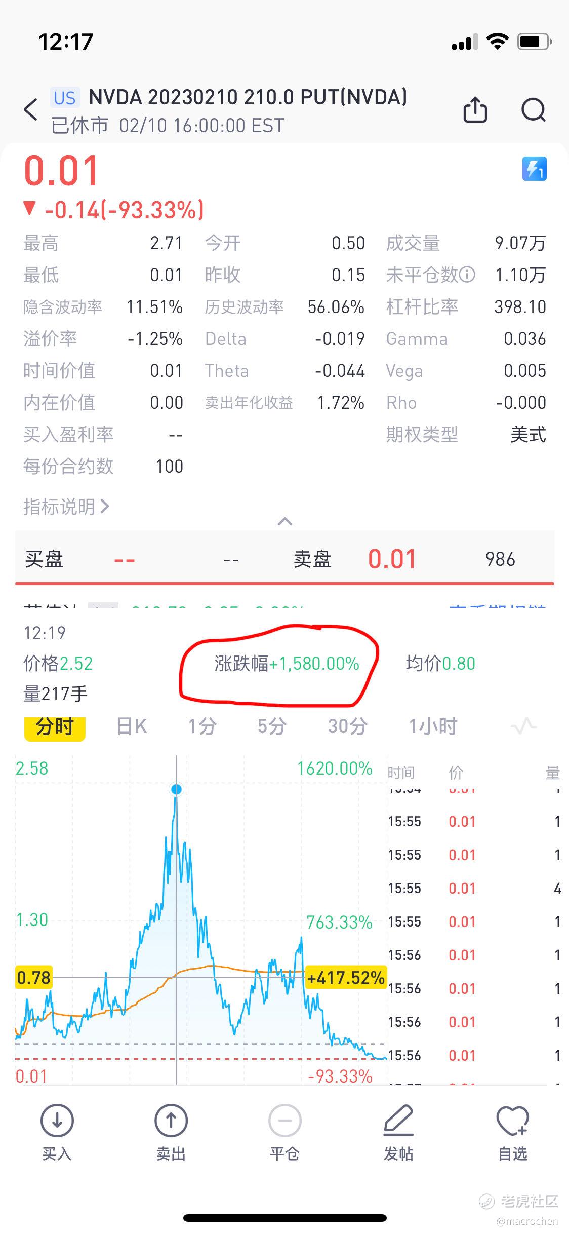 开仓的delta我的印象中应该在0.05以内, 被行权的概率非常低, 权利金也不多, 0.16, 看iv也是迅速下降的, 再加上是到期最后一天theta的加持, 时间价值迅速萎缩, 几乎不需要做什么对冲保护, 毕竟也没多少钱, 所以我直接是sell naked put, 权利金到手应该是十拿九稳的. 而实际情况是, 从开盘的盈利, 亏损一步步扩大, 最后在亏损1k时止损(我同时做了roll over处理, 将亏损推迟到下周, 可以理解为暂时浮亏). 股价从220+跌到207+, 最大跌幅在6%+, 权利金最高涨幅15倍. 但是反转来了, 最终股价又回到了210的上方, 以期权作废收场.