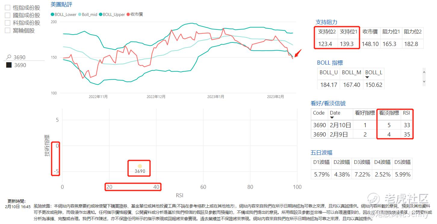 根据技术指标分析,美团上周五收市的看淡指标占多;相对强弱指数 RSI 数值为33,前值35,数值反映当前位于弱势,出现下跌概率相对较大。上周五收市价位于保利加通道的底线(150.62)之下。预计支持位位于139.3元,跌穿则有机会下试123.4。