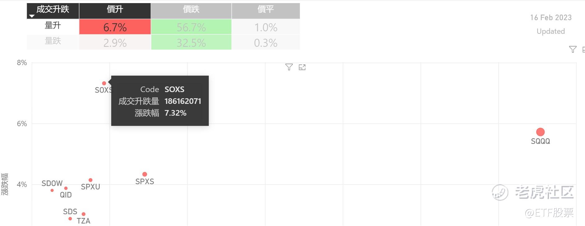 如果考虑部署短期追升ETF,可以考虑以下品种,比如$三倍做空半导体ETF-Direxion Daily(SOXS)$ 、SQQQ以及SPXS三只ETF都分别呈现价量齐升的型态,三者分别录得7.32%、5.72%以及4.33%的升幅。