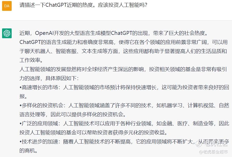 近期ChatGPT火爆出圈,带动人工智能板块快速走红。小虎从诞生起就贴上了“科技”的标签,当然也会对这一风靡全球的科技浪潮充满好奇。于是小虎去请教了ChatGPT“应该投资人工智能吗?” 和“ChatGPT相关基金是否有长期投资价值?”这两个问题,想了解当下最热门的人工智能机器人能给出怎样的建议。以下是ChatGPT给出的回答: