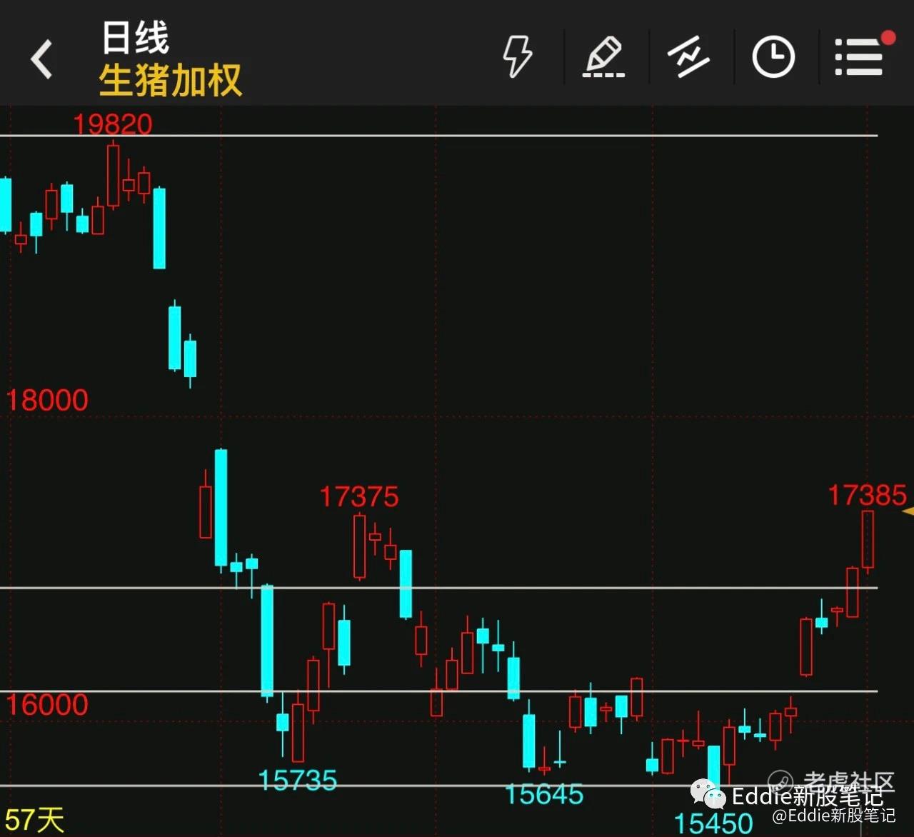 群里小伙伴说我就吹牛水平上差点,哈哈哈,那今天开头就水两句...不知道商品期货有没人做?今天A港都大跌,但并不影响晚饭加个鸡腿...生猪按今天收盘价17380算,涨幅1930点,每5点变动价位80元,一手盈利30880元,注意两手乘以2以此类推!当然底是很难买到的,但也大差不差,风水轮流转,场子那么多挣钱的机会有的是,肯定不能抱着一棵树死啃啊,没事就当看个乐吧~