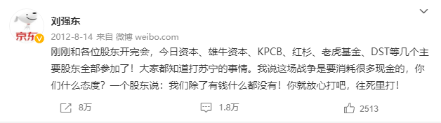 我们回顾刘强东2012年发布的一条微博,就能感受到得到巨额融资后,刘强东的底气。刘强东称,“大家都知道打苏宁的事情。我说这场战争是要消耗很多现金的,你们什么态度?一个股东说:我们除了有钱什么都没有!你就放心打吧,往死里打!”