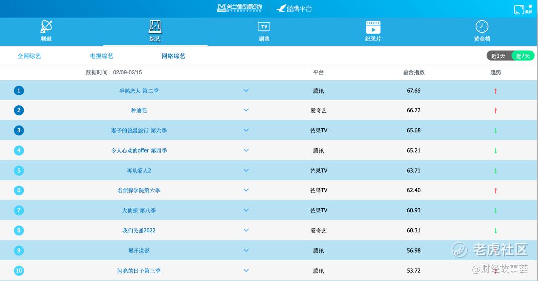 根据蓝鹰平台发布的融合传播指数,最近一周内,全网综艺(不包含电视综艺)Top10中,《半熟恋人2》轻松拿下榜首,腾讯视频和芒果TV各自入围4部,合计占据八成份额。