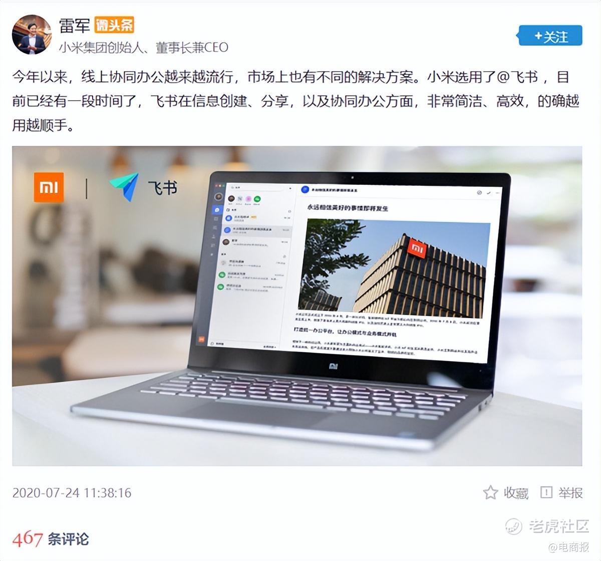 2020年,雷军突然在微头条上为飞书站台,他表示:“飞书在信息创建、分享,以及协同办公方面,非常简洁、高效,的确越用越顺手。”