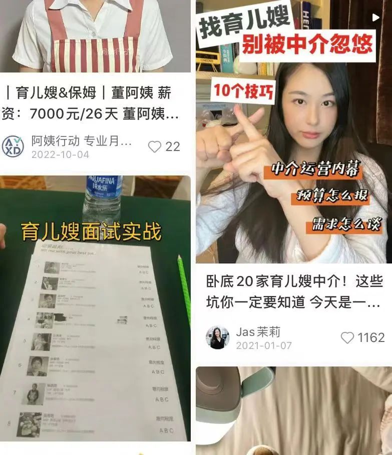 很多年轻妈妈会去小红书上“取经”,寻找育儿嫂攻略,或者“捡漏”好阿姨。但雅雯发现,小红书上很快出现层出不穷的、以妈妈口吻出现的“营销软文”,说自己用的阿姨有多么优秀,现在要下户了。一旦有妈妈加上博主联系方式,便会发现对方的真实身份其实就是中介。