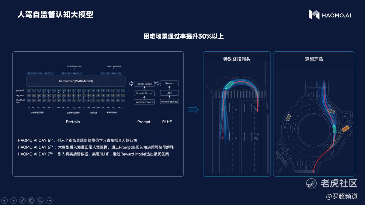 毫末的认知决策算法经历了三个阶段的进化。第一阶段是引入个别场景的端到端模仿学习,直接拟合人驾行为。第二阶段是通过认知大模型,引入海量正常人驾数据,通过Prompt的方式实现认知决策的可控、可解释。第三阶段,也就是当前阶段,通过引入真实接管数据,并且在大模型中开始尝试使用RLHF算法,对人驾接管数据进行学习。为此,毫末构建了一个包含“旧策略、接管策略、人工label策略”的Pairwise排序模型。基于这一排序模型,毫末构建了自动驾驶决策的奖励模型(reward model),从而在各种规划场景情况下做出最优的决策。通过这一大模型,在掉头、环岛等公认的困难场景中,场景通过率提升30%以上。