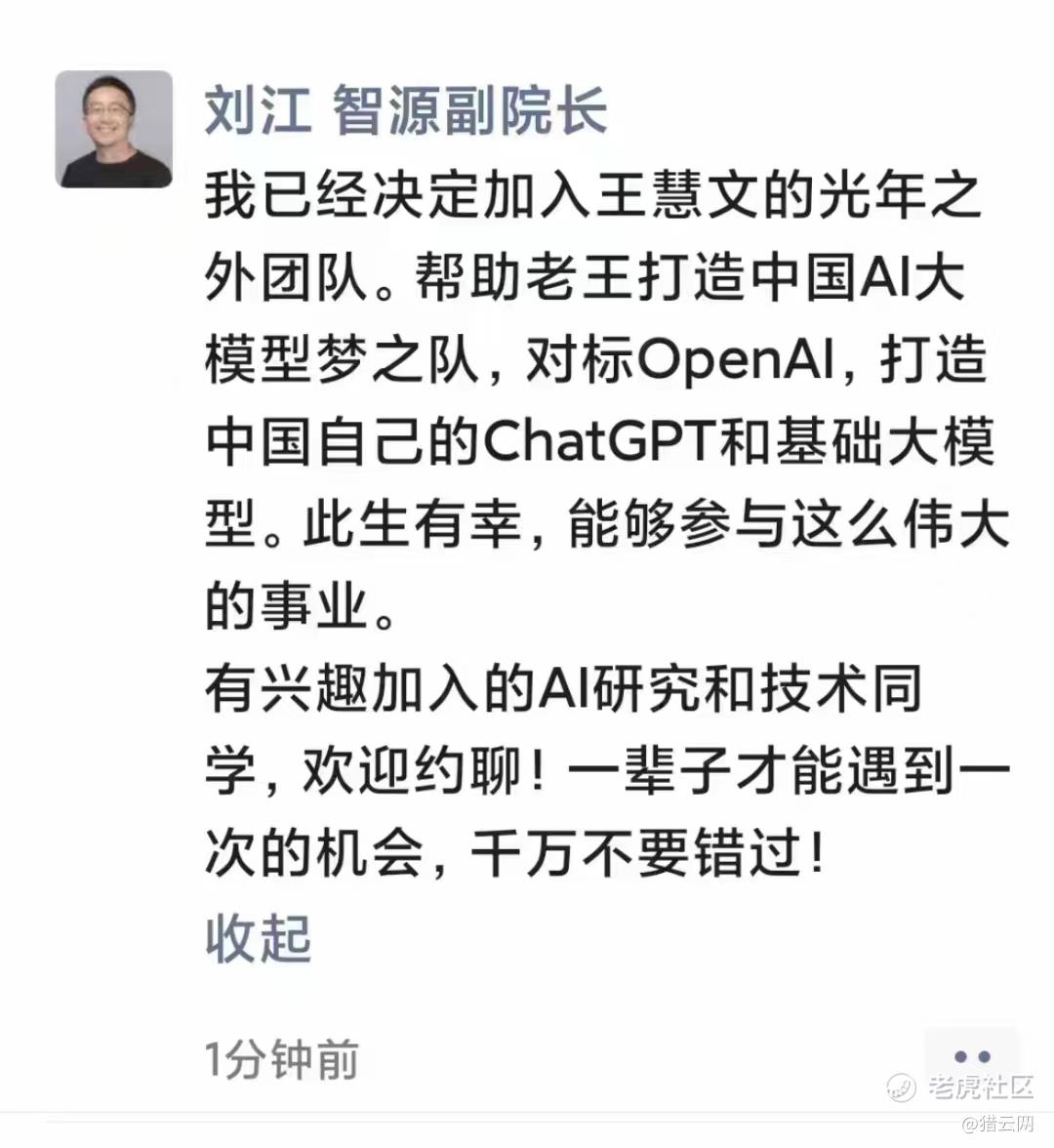 刘江称,将帮助老王(王慧文)打造中国AI大模型梦之队,对标OpenAl,打造中国自己的ChatGPT和基础大模型。此生有幸,能够参与这么伟大的事业。