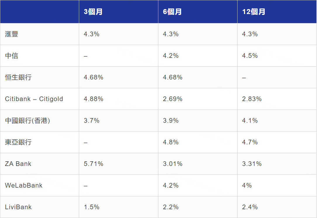 目前香港地区的一年期定期存款利率,绝大多数在4.8%以下,汇丰之类的仅4.3%,而且大多还有最低起存额。