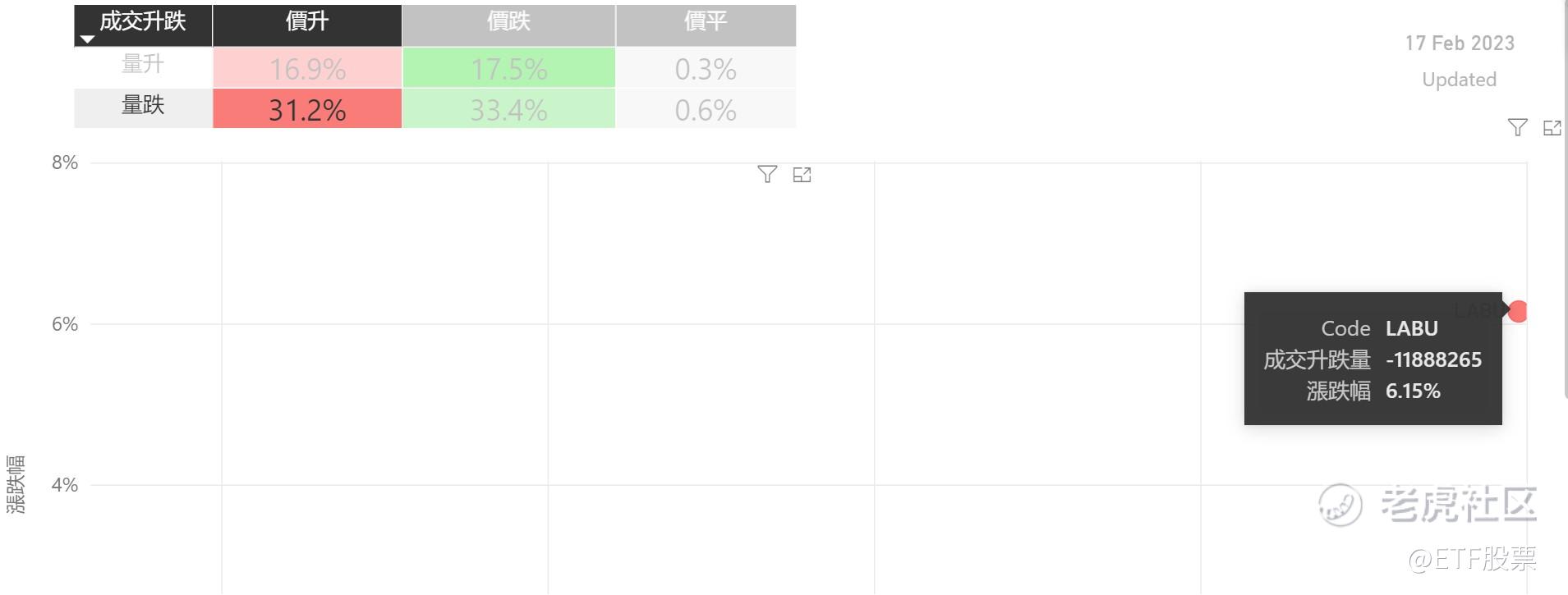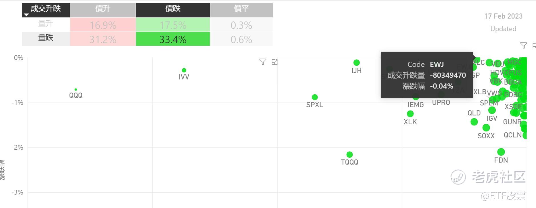 在2月17日的美股主要300只ETF交易品种中,录得有48%的ETF交易品种的ETF价格上升;尽管录得不过半数的ETF价格录得上升,不过仍有31%的ETF产品,虽然价格上升,成交额却下跌。