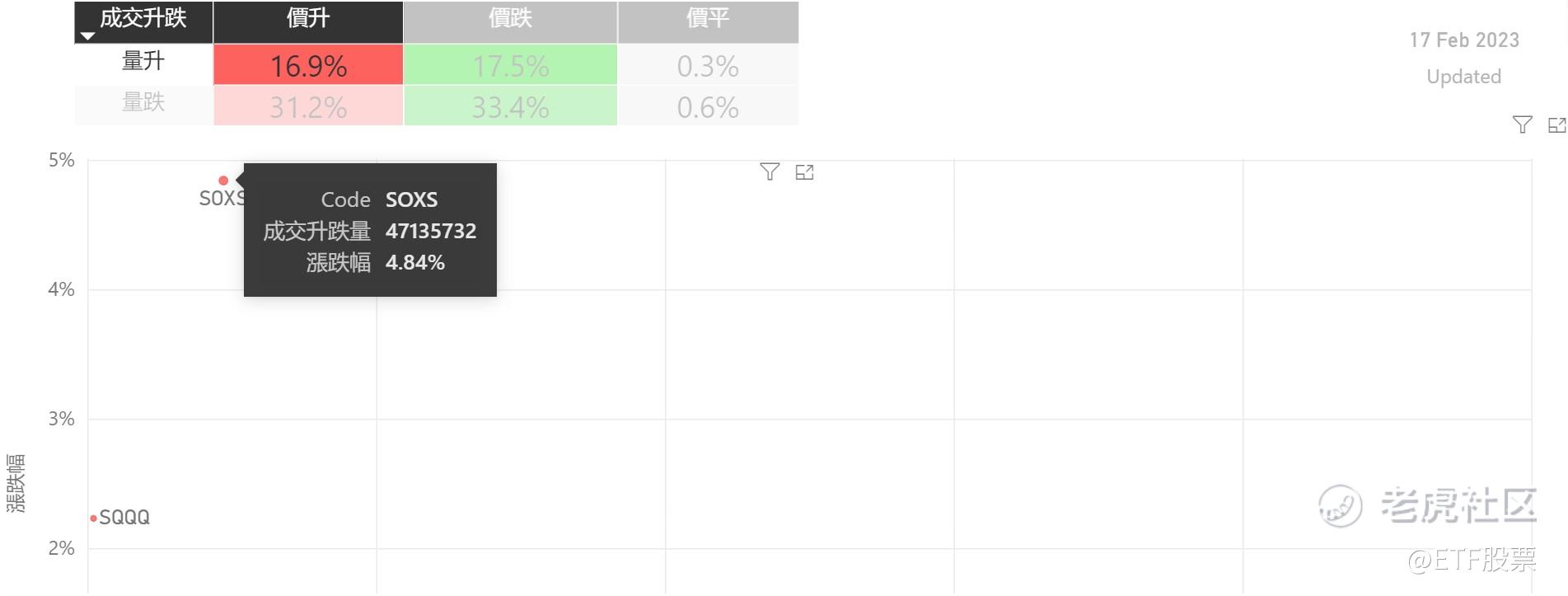 如果考虑部署短期追升ETF,可以考虑以下品种,比如 $三倍做空半导体ETF-Direxion Daily(SOXS)$ 、SQQQ以及XLP三只ETF都分别呈现价量齐升的型态,三者分别录得4.84%、2.23%以及1.29%的升幅。